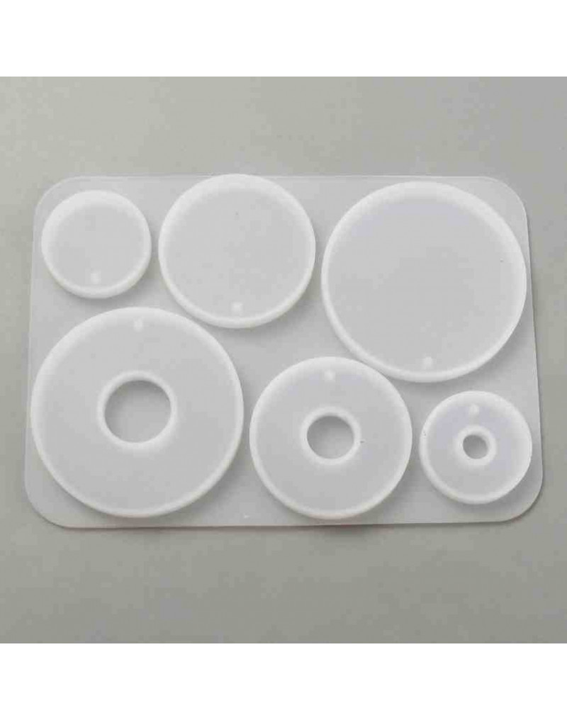 Molde para resina. Dijes. Monedas-donas 3 tamaños diferentes. 104x74x5 mm. 1,6 mm perforación. 1 ud.